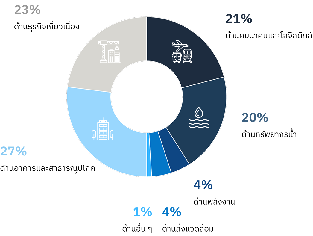 ด้านการคมนาคมและโลจิสติกส์ ด้านทรัพยากรน้ำ ด้านอาคารและสาธารณูปโภค ด้านสิ่งแวดล้อม ด้านพลังงาน และได้ขยายงานบริการไปยังธุรกิจที่เกี่ยวเนื่อง