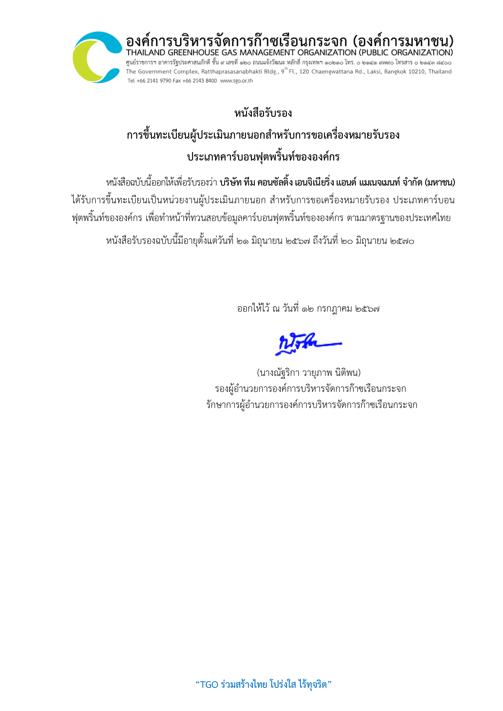 ทำการทวนสอบอย่างอิสระว่า CFO ขององค์กรที่รายงานและบัญชีรายชื่อก๊าซเรือนกระจกโดยรวมนั้นถูกต้อง สมบูรณ์ และเป็นไปตามมาตรฐานที่เกี่ยวข้อง (เช่น ISO 14064-1, GHG Protocol) เพื่อเพิ่มความน่าเชื่อถือให้กับรายงานความยั่งยืนและการเปิดเผยข้อมูลสาธารณะ