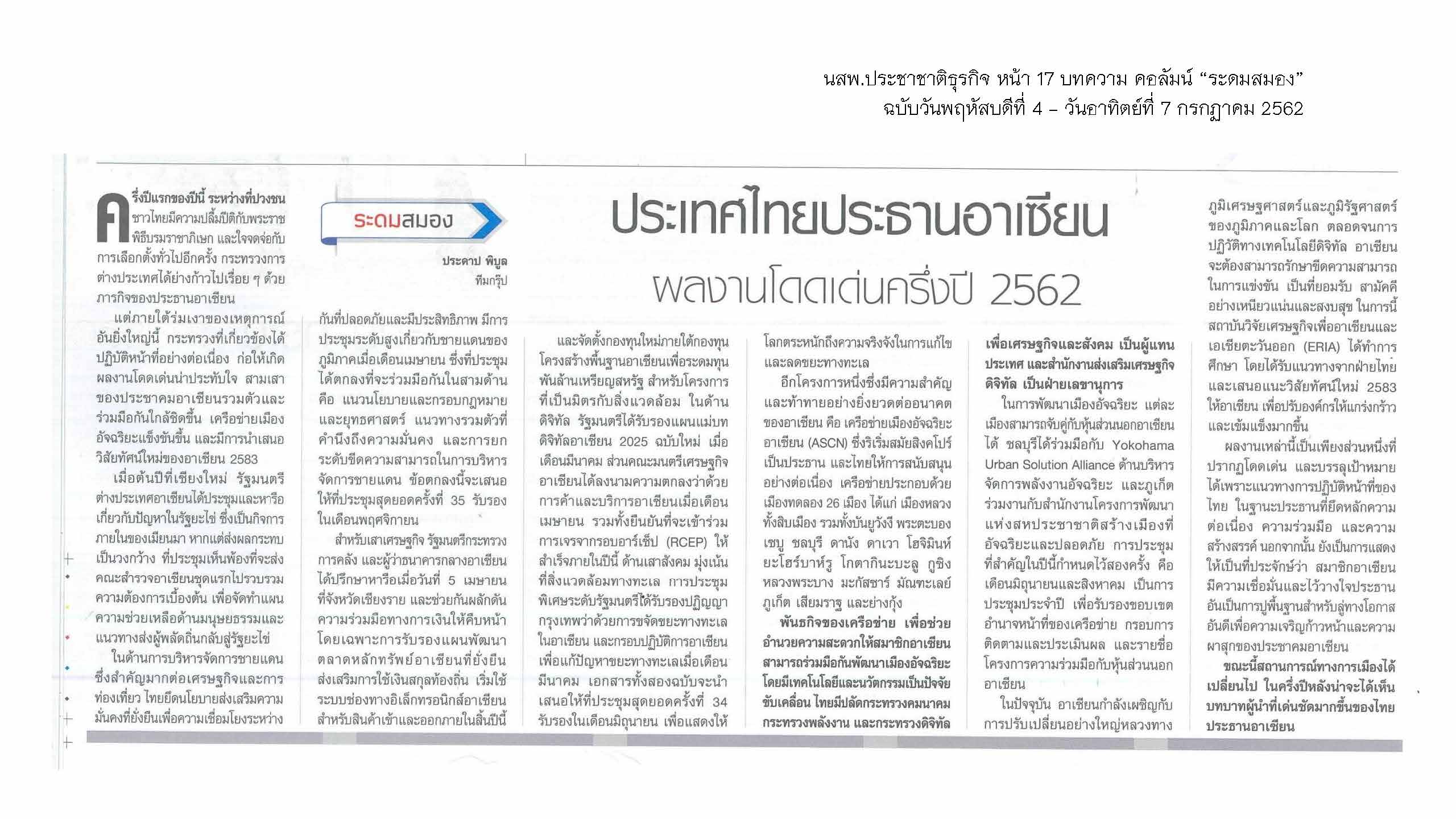 อ่าน “ประเทศไทยประธานอาเซียน ผลงานโดดเด่นครึ่งปี 2562” โดย คุณประดาป พิบูลสงคราม ทีมกรุ๊ป ตีพิมพ์ใน นสพ.ประชาชาติธุรกิจ ฉบับวันที่ 4-7 กรกฏาคม 2562 เซคชั่นบทความ หน้า 17 คอลัมน์ “ระดมสมอง”