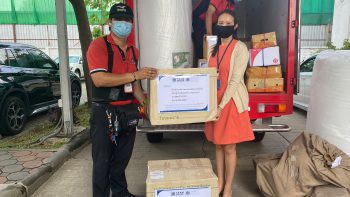 Implementing the TEAM GROUP Fights COVID-19 project, TEAM GROUP and TEAM GROUP Foundation, represented by Dr. Prasert Patramai, Founder and Honorary Chairman (fourth from the right), Mr. Chawalit Chantararat, Chairman of the Executive Committee, Dr. Aphichat Sramoon, CEO, and a group of executives, presented the following donations to supportmedicaloperationsintheeffort tocombat thepandemic: necessitiesfor thecommunityisolationcenteratSaphanTemple; rubbingalcohol forSawanpracharak Hospital in NakhonSawan and Maharaj Nakorn Chiang Mai Hospital in Chiang Mai; and 100boxes of face masks for Thammasat University Hospital.