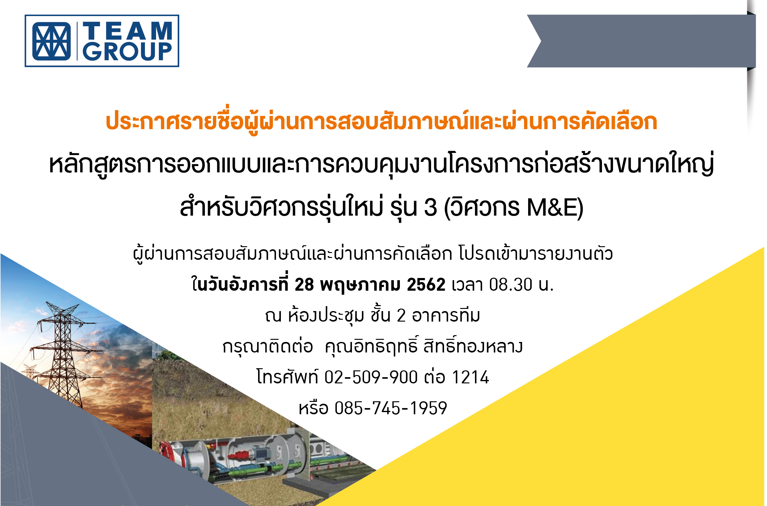“ประกาศรายชื่อผู้มีสิทธิ์เข้าสอบสัมภาษณ์ หลักสูตรการออกแบบและการควบคุมงานโครงการก่อสร้างขนาดใหญ่สำหรับวิศวกรรุ่นใหม่ รุ่น 3 (วิศวกร M&E)”