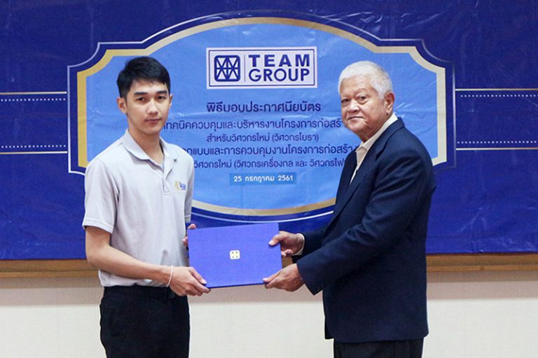 คุณพีรวัธน์ เปรมชื่น กรรมการ ทีมกรุ๊ป มอบประกาศนียบัตรหลักสูตร “เทคนิคควบคุมและบริหารงานก่อสร้างขนาดใหญ่สำหรับวิศวกรใหม่ รุ่น 3 (วิศวกรโยธา)” และหลักสูตร “การออกแบบและการควบคุมงานโครงการก่อสร้างขนาดใหญ่ สำหรับวิศวกรใหม่ รุ่น 2 (วิศวกรเครื่องกลและวิศวกรไฟฟ้า)” จากนั้นคุณชวลิต จันทรรัตน์ ดร.สิริมิตร บุญยืน ดร.อภิชาติ สระมูล คุณมยุรี ก้วยเจริญพานิชก์ และคุณดนัยศักดิ์ ปัญญาไว ได้มอบบัตรพนักงานให้แก่วิศวกรใหม่ และจัดพิธีผูกข้อมือเพื่อเป็นการรับขวัญน้องๆ ทั้ง 32 คน จัดโดย สถาบันการบริหารจัดการและเทคโนโลยี่ (IMT)