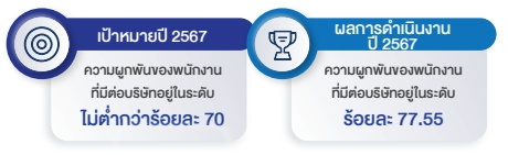เพื่อให้สามารถติดตามและพัฒนาความผูกพันของพนักงานอย่างต่อเนื่อง บริษัทได้กำหนดให้มีการประเมินความผูกพันของพนักงานปีละ 1 ครั้ง โดยการสำรวจความคิดเห็นของพนักงานเกี่ยวกับสภาพแวดล้อมการทำงาน ความพึงพอใจ และปัจจัยที่มีผลต่อแรงจูงใจในการทำงาน ผลลัพธ์ที่ได้รับจะถูกนำมาวิเคราะห์เพื่อพัฒนาแนวทางในการเสริมสร้างวัฒนธรรมองค์กรที่แข็งแกร่ง และปรับปรุงสวัสดิการ รวมถึงนโยบายที่ตอบสนองต่อความต้องการของพนักงานให้ดียิ่งขึ้น ในปี 2567 บริษัทมีผลสำรวจความผูกพันของพนักงาน ที่ 77.55%