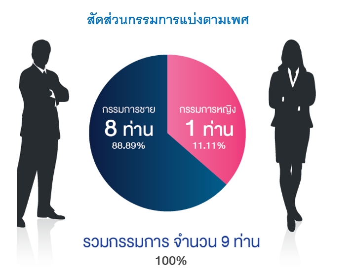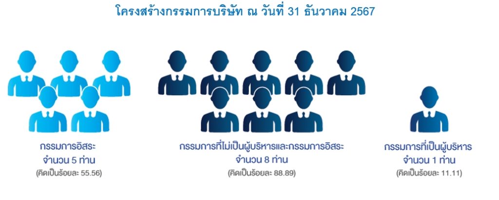 คณะกรรมการบริษัทประกอบด้วยผู้ทรงคุณวุฒิที่มีความหลากหลายในด้านทักษณะความชำนาญ ความรู้ ประสบการณ์ เพศ และอายุ อันเป็นประโยชน์ต่อการดำเนินธุรกิจของบริษัท ซึ่งบริษัทมีคณะกรรมการจำนวน 9 ท่าน โดยกรรมการบริษัททั้ง 9 ท่าน มีกรรมการที่เป็นเพศหญิง 1 ท่าน และมีกรรมการที่มีคุณสมบัติเป็นกรรมการอิสระ 6 ท่านของกรรมการทั้งหมดเพื่อเป็นการถ่วงดุลคณะกรรมการ โดยคุณสมบัติของกรรมการอิสระเป็นไปตามเกณฑ์ที่สำนักงาน ก.ล.ต. กำหนด