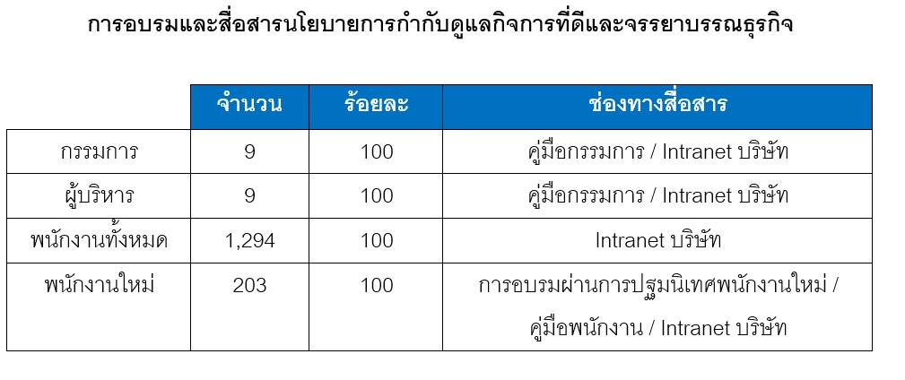 บริษัทได้มีการติดตามให้เกิดการปฏิบัติตามหลักการกำกับดูแลกิจการที่ดีซึ่งครอบคลุมประเด็นที่สำคัญ อาทิ การปฏิบัติตามจริยธรรมและจรรยาบรรณธุรกิจ การป้องกันความขัดแย้งทางผลประโยชน์ การใช้ข้อมูลภายในเพื่อแสงหาผลประโยชน์ และการต่อต้านการทุจริตคอร์รัปชัน เป็นต้น โดยบริษัทได้มีการสื่อสารจรรยาบรรณธุรกิจและนโยบายที่เกี่ยวข้องกับประเด็นข้างต้น ไว้บนเว็บไซต์และ Intranet ของบริษัท บรรจุไว้ในคู่มือกรรมการซึ่งจัดส่งให้กรรมการและผู้บริหารทุกคนครบร้อยละ 100 เพื่อสื่อสารเน้นย้ำความเข้าใจสำหรับกรรมการและผู้บริหารระดับสูงอย่างต่อเนื่อง และอบรมด้านจรรยาบรรณธุรกิจให้กับพนักงานที่เข้ามาใหม่ จำนวน 203 คน คิดเป็นร้อยละ 100 ของพนักงานใหม่ปี 2567 ทั้งหมด ผ่านกระบวนการปฐมนิเทศพนักงาน โดยมีวัตถุประสงค์เพื่อให้กรรมการ ผู้บริหาร และพนักงาน ของบริษัทรับทราบและยึดถือปฏิบัติโดยเคร่งครัด โดยในปี 2567 ไม่มีกรณีการฝ่าฝืนจริยธรรมธุรกิจของผู้บริหารและพนักงาน รวมถึงมีการปฏิบัติตามนโยบายด้านกำกับดูแลกิจการที่ดีทุกฉบับอย่างเคร่งครัด