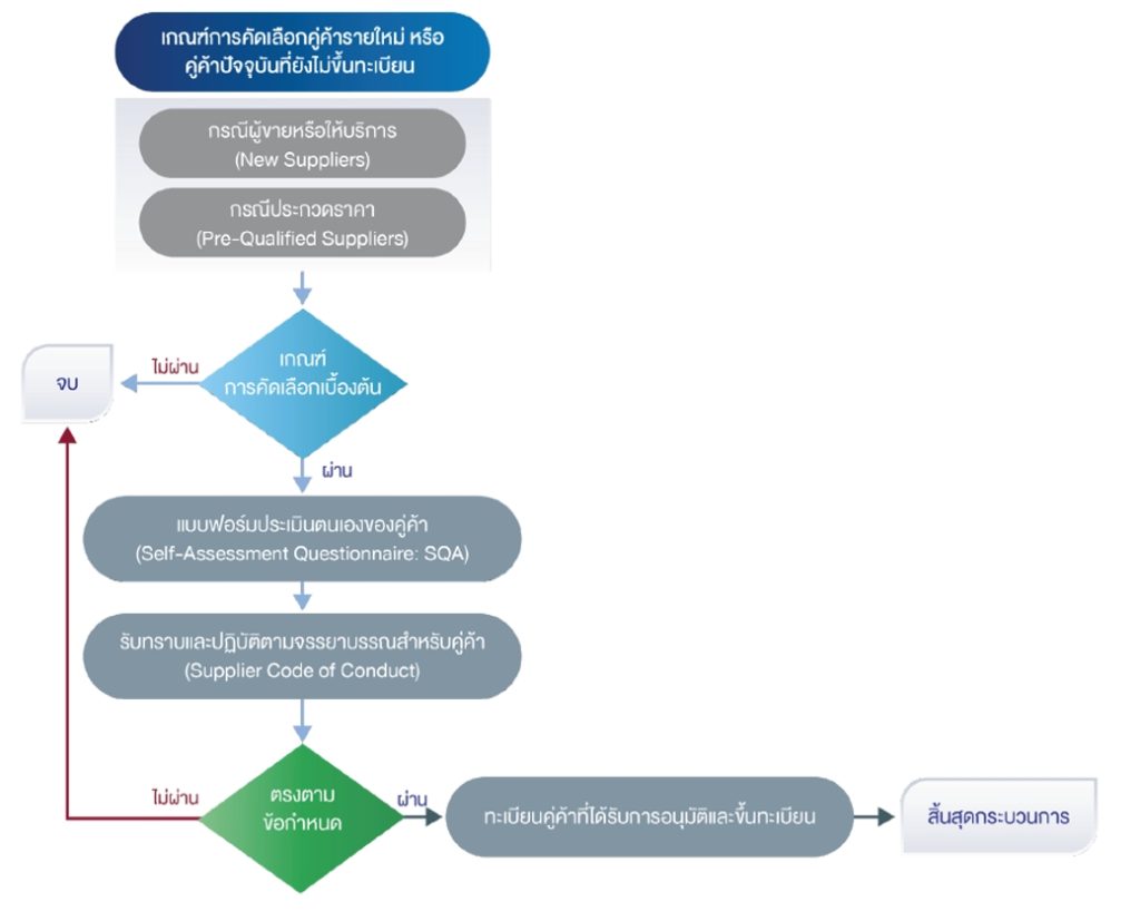 บริษัทให้ความสำคัญในการพิจารณาคุณสมบัติของคู่ค้า นอกจากเรื่องของคุณภาพของสินค้าและบริการแล้ว ยังได้คำนึงถึงประเด็นทางด้านสังคม สิ่งแวดล้อม และบรรษัทภิบาล ซึ่งบริษัทจะประเมินและคัดเลือกคู่ค้ารายใหม่ โดยใช้หลักเกณฑ์การประเมินที่ครอบคลุมทางด้านความยั่งยืนผ่านการประเมินตนเองของคู่ค้า (Self-Assessment Questionnaire: SAQ) พร้อมทั้งจัดส่งจรรยาบรรณธุรกิจสำหรับคู่ค้า (Supplier Code of Conduct) เพื่อให้คู่ค้ารับทราบและปฏิบัติตาม