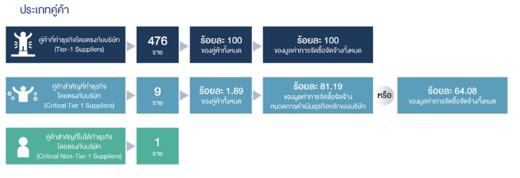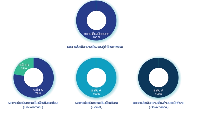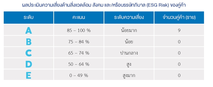- ผลการประเมินความเสี่ยงด้านบรรษัทภิบาล: คู่ค้าทางตรงรายสำคัญมีความเสี่ยงน้อยมาก (ระดับ A) จำนวน 9 ราย