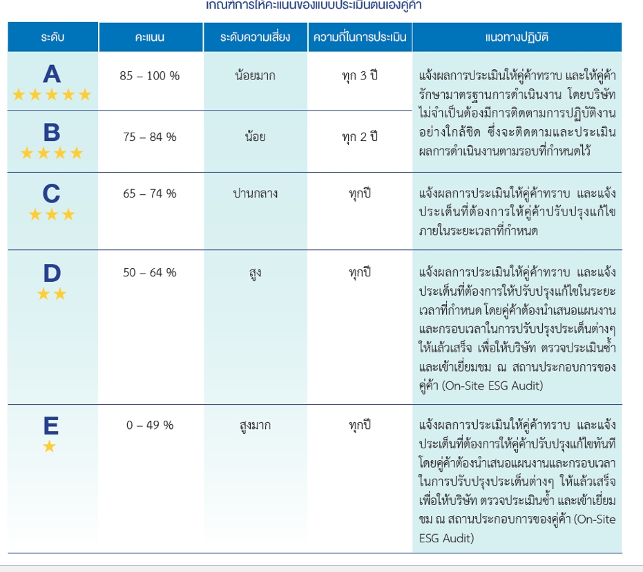 - คู่ค้าทางตรงรายสำคัญ (Critical Tier 1 Suppliers) ที่มีผลประเมินความเสี่ยงในระดับน้อยมาก ต้องทำแบบประเมินตนเอง (Self-Assessment Questionnaire: SAQ) เป็นประจำอย่างน้อย 1 ครั้งในรอบ 3 ปี เพื่อประเมินความสอดคล้องกับจรรยาบรรณคู่ธุรกิจและสร้างการรับรู้ถึงทิศทางการดำเนินงานด้านความยั่งยืนแก่คู่ค้า และหากมีผลประเมินความเสี่ยงในระดับน้อย ต้องทำแบบประเมินตนเอง (Self-Assessment Questionnaire: SAQ) เป็นประจำ ทุก ๆ 2 ปี