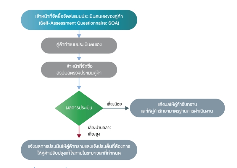 เจ้าหน้าที่จัดซื้อจัดส่งแบบประเมินตนเองของคู่ค้า (Self-Assessment Questionnaire: SAQ) เพื่อประเมินความเสี่ยงของคู่ค้าที่ครอบคลุมประเด็นด้านสิ่งแวดล้อม สังคม และ/หรือบรรษัทภิบาล (ESG Risk) ซึ่งข้อคำถามดังกล่าวจะสอดคล้องกับแนวปฏิบัติจรรยาบรรณคู่ธุรกิจ(Supplier Code of Conduct) ที่ทางบริษัทได้กำหนดไว้ หลังจากนั้นจะทำการสรุปผลการประเมินให้คู่ค้าทราบ หากคู่ค้ารายใดที่มีความเสี่ยง ทางเจ้าหน้าที่จัดซื้อจะแจ้งประเด็นที่ต้องการให้คู่ค้าปรับปรุงแก้ไขในลำดับถัดไป