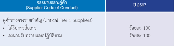 - ร้อยละ 100 ของคู่ค้าทางตรงรายสำคัญ รับทราบและปฏิบัติตามจรรยาบรรณคู่ธุรกิจ