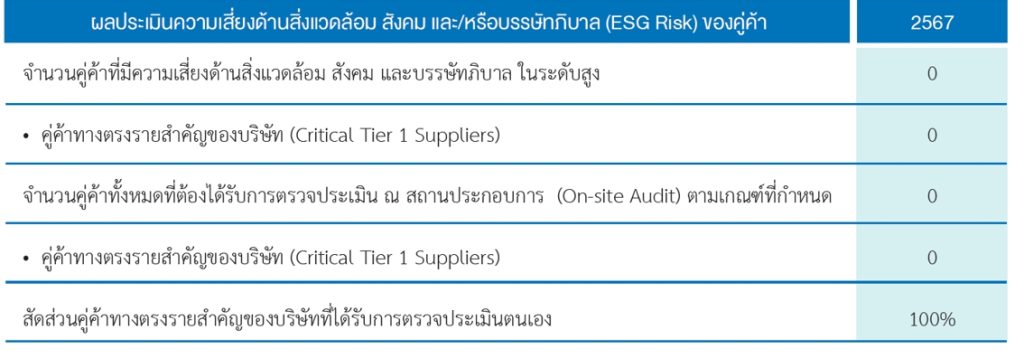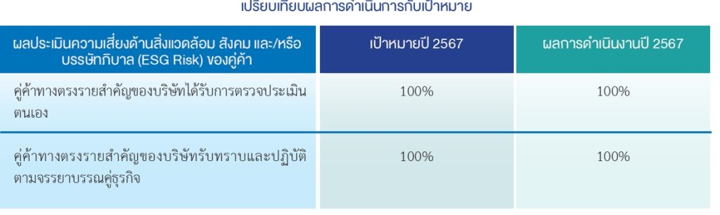 - ร้อยละ 100 ของคู่ค้าทางตรงรายสำคัญได้รับการตรวจประเมินด้านสิ่งแวดล้อม สังคม และ/หรือบรรษัทภิบาล (ESG Risk)