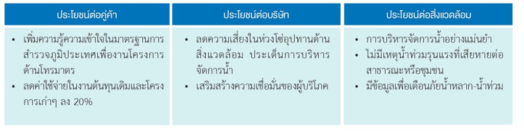 โครงการได้จัดฝึกอบรมให้แก่พนักงานของบริษัทคู่ค้า 2 บริษัท จำนวน 10 คน คิดเป็นคู่ค้าทางตรงรายสำคัญร้อยละ 11 ของคู่ค้าทางตรงรายสำคัญทั้งหมด ซึ่งจะเป็นผู้ถ่ายทอดความรู้ มาตรฐาน เกณท์ และข้อมูลที่ได้จากการอบรม แก่ผู้ปฏิบัติการของคู่ค้า เพื่อนำไปปฏิบัติงานของโครงการ ผลของการฝึกอบรม คู่ค้าสามารถผลิตผลงานสำรวจที่ตรงตามหลักวิชาการลดการแก้ไขงานไปได้มาก ทำให้ลดค่าใช้จ่ายลงได้ถึงร้อยละ 20 และบรรลุวัตถุประสงค์ของโครงการ ส่งมอบได้ตามกำหนด การได้ข้อมูลภูมิประเทศที่ถูกต้องทำให้การทำนายสถานการณ์น้ำมีความแม่นยำสูงเป็นประโยชน์ในการบริหารจัดการน้ำโดยรวมและสามารถเตือนภัยประชาชนได้แม่นยำ โครงการลักษณะนี้ยังมีโครงการต่อเนื่องอีกหลายโครงการในอนาคตการอบรมจึงเป็นการช่วยเหลือและพัฒนาที่เป็นประโยชน์อย่างยิ่งต่อองค์กร คู่ค้า และส่วนรวม โดยสรุปประโยชน์หลัก ๆ ได้ดังนี้