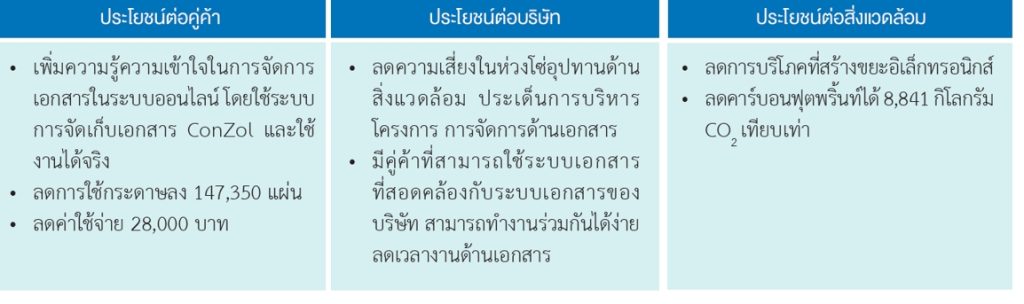 โครงการที่ปรึกษาควบคุมงานก่อสร้างโรงงานผลิตสารออกฤทธิ์ในยา ได้นำระบบ ConZol ซึ่งเป็นระบบการจัดเก็บและอนุมัติเอกสารเข้ามาใช้ในโครงการ โดยได้อบรมถ่ายทอดองค์ความรู้และกระบวนการทางเอกสารให้กับบุคลากรของบริษัท บอส ฟาร์มาแคร์ จำกัด (BOSS) หรือ ผู้ผลิตยาธาตุน้ำขาวตรากระต่ายบินและผู้รับจ้างก่อสร้าง ซึ่งคือ บริษัท อิตัลไทยวิศวกรรม จำกัด (ITE) ให้ทำการจัดเก็บเอกสารบนระบบออนไลน์แทนการใช้เอกสารกระดาษซึ่งต้องทำการจัดพิมพ์ เอกสารทั้งโครงการจนสิ้นสุดสัญญามีจำนวน 2947 ฉบับ คิดเป็นจำนวน 147,350 แผ่น การใช้ระบบ ConZol มาจัดเก็บและอนุมัติเอกสารทำให้มีประโยชน์คุ้มค่า ยั่งยืน ลดปริมาณการใช้กระดาษ ลดการตัดต้นไม้ที่ใช้ทำกระดาษ สนับสนุนแนวคิด Paperless ลดคาร์บอนฟุตพรินต์จากการผลิตและขนส่งเอกสาร ลดการใช้พลังงานจากเครื่องพิมพ์ หมึกพิมพ์ และการขนส่งเอกสาร โดยสามารถลดคาร์บอนฟุตพริ้นท์จากการผลิตและขนส่งเอกสารได้ถึง 8,841 กิโลกรัม CO2 เป็นอย่างต่ำ ลดขยะอิเล็กทรอนิกส์จากเครื่องพิมพ์ ลดความต้องการใช้เครื่องพิมพ์ หมึกพิมพ์ และวัสดุสิ้นเปลืองที่เกี่ยวข้อง นอกจากนี้ยังเพิ่มความสะดวกในการทำงานร่วมกัน รองรับการทำงานแบบ Remote Working และเพิ่มความโปร่งใสและความปลอดภัยของข้อมูล ระบบออนไลน์ช่วยให้สามารถติดตามเวอร์ชันเอกสาร และบันทึกประวัติการเข้าถึงและอนุมัติเอกสารได้ ลดโอกาสของการปลอมแปลงหรือการสูญหายของเอกสาร เป็นประโยชน์ร่วมของโครงการ คู่ค้าและสิ่งแวดล้อมของโลก โดยคู่ค้ายังสามารถนำระบบและความรู้ที่ได้รับจากการอบรมและใช้งานจริงไปใช้ในโครงการต่อไปได้อีกในอนาคต โดยสรุปประโยชน์หลัก ๆ ได้ดังนี้