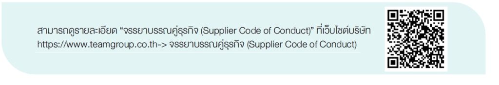 โดยบริษัทได้จัดทำจรรยาบรรณคู่ธุรกิจ (Supplier Code of Conduct) ขึ้นมาเพื่อเป็นคู่มือในการสื่อสารเกี่ยวกับแนวปฏิบัติขั้นพื้นฐาน โดยกำหนดแนวทางปฏิบัติร่วมกันระหว่างบริษัทและคู่ค้า อาทิ ดำเนินธุรกิจอย่างซื่อสัตย์สุจริต เป็นธรรมกับผู้มีส่วนได้เสียทุกฝ่าย เปิดเผยข้อมูลอย่างถูกต้องครบถ้วน รักษาความลับ และเคารพในทรัพย์สินทางปัญญาของผู้อื่น และดำเนินธุรกิจโดยคำนึงถึงผลกระทบต่อทรัพยากรธรรมชาติและสิ่งแวดล้อม เช่น การใช้ผลิตภัณฑ์ที่เป็นมิตรต่อสิ่งแวดล้อม (Green Products) เป็นต้น โดยได้เปิดเผยไว้บนเว็บไซต์ของบริษัท ภายใต้หัวข้อ “การกำกับดูแลกิจการ > นโยบายการกำกับดูแลกิจการ” เพื่อให้คู่ค้ารับทราบและให้ความร่วมมือในการดำเนินการ
