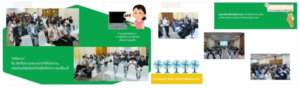 การอนุรักษ์พลังงานในสำนักงาน คณะทำงานด้านการจัดการพลังงาน บริษัทรณรงค์ และเผยแพร่ข้อมูลความรู้ในช่องทางการสื่อสารภายในของบริษัท เช่น อินทราเน็ต เฟซบุ๊กภายในของบริษัท บอร์ดประชาสัมพันธ์ในลิฟท์ เป็นต้น เกี่ยวกับเคล็ดลับการประหยัดพลังงานให้กับพนักงาน เช่น การรณรงค์ให้ปิดเครื่องใช้ไฟฟ้าเมื่อไม่ใช้งาน เปิดเครื่องปรับอากาศในอุณหภูมิที่เหมาะสม 25-26 องศา