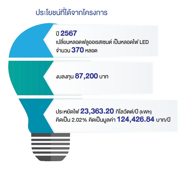 การลดการใช้พลังงานในการทำงาน รณรงค์ให้พนักงานปิดไฟช่วงพักกลางวันในแต่ละวัน และการเปลี่ยนมาใช้อุปกรณ์ประหยัดพลังงานในอาคารทั้งอาคาร เช่น หลอดไฟฟ้าแบบประหยัด (LED) รวมไปถึงโดยการศึกษาแนวทางการลดการใช้น้ามัน เช่น การจัดซื้อจัดจ้างรถยนต์ไฟฟ้า EV มาใช้ทดแทนรถยนต์เดิม